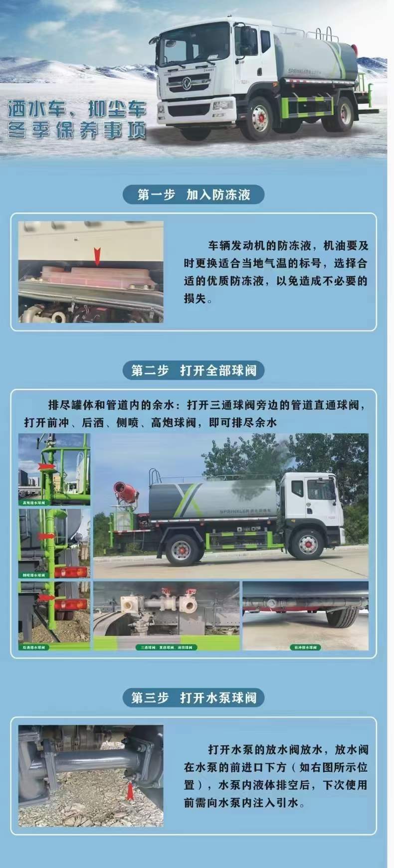 當氣?溫低于?零度時,應及時?打開灑水車所有管道閥門,排盡灑水車罐?體及管道?余水,并使球閥保護打開狀態,防止?管道、球閥凍?裂。