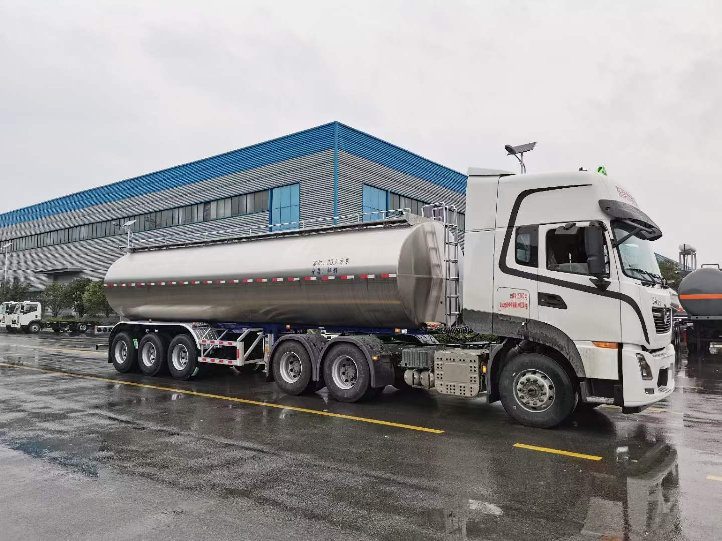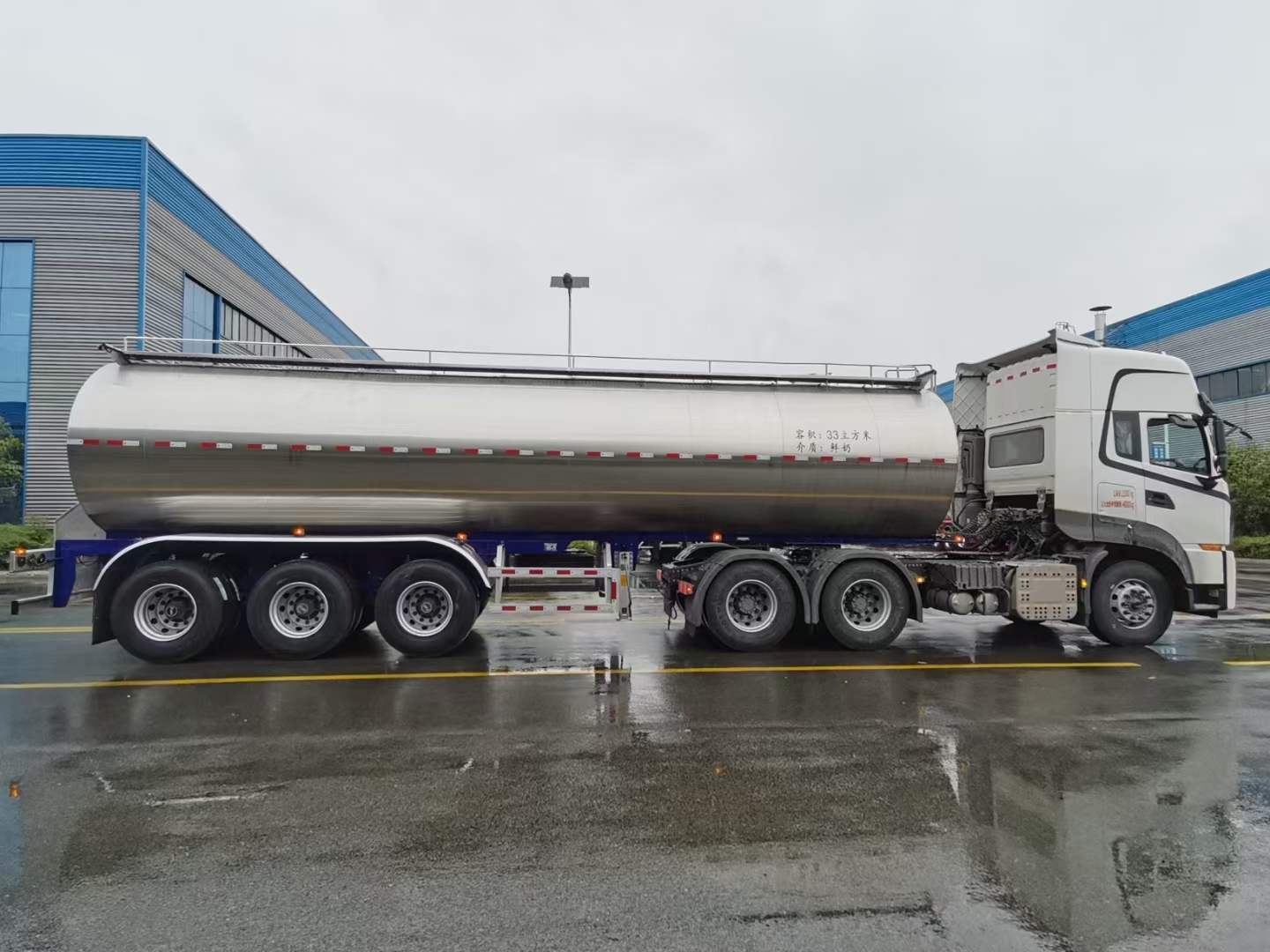 鮮奶運輸半掛車,食品級不銹鋼內膽,夾層聚氨酯發泡保溫,不銹鋼外蒙皮。食品級不銹鋼管道及球閥。